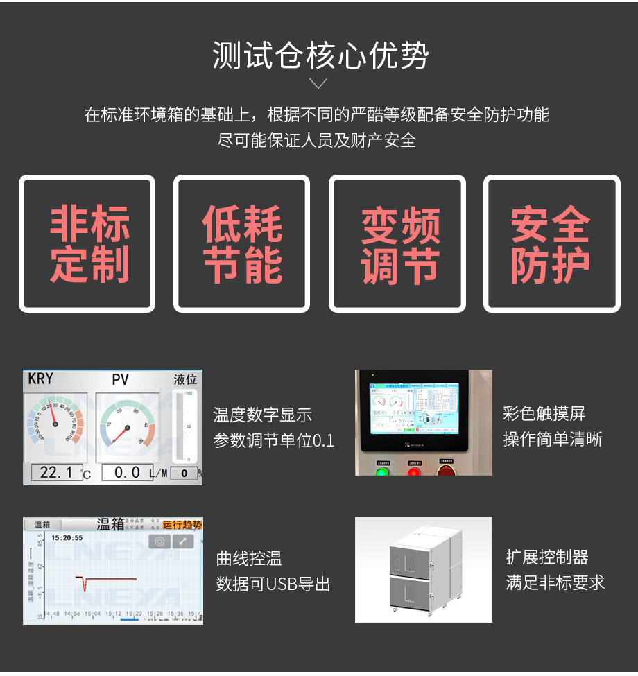 本系列沖擊試驗箱采用冷熱兩箱結(jié)構(gòu),利用提籃快速轉(zhuǎn)換試驗樣品到試驗區(qū)域,達到冷熱沖擊試驗?zāi)康模?該沖擊方式大限度的減少了冷熱沖擊時的熱負載,縮短了溫度恢復時間;變頻自定算法控制,機組運行綜合節(jié)能35%以上。