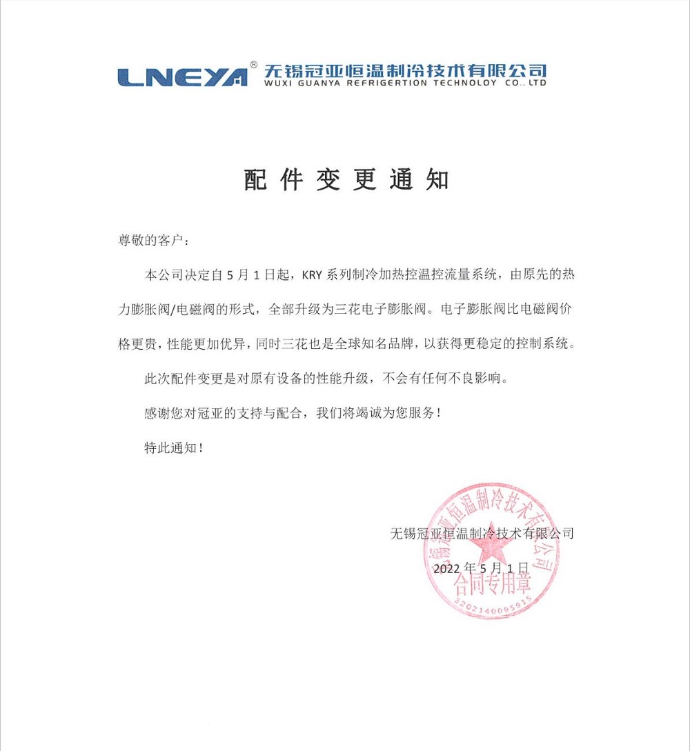 本公司決定自5月1日起, KRY 系列制冷加熱控溫控流量系統(tǒng),由原先的熱力膨脹閥/電磁閥的形式,全部升級(jí)為三花電子膨脹閥。電子膨脹閥比電磁閥價(jià)格更貴,性能更加優(yōu)異,同時(shí)三花也是全球品牌,以獲得更穩(wěn)定的控制系統(tǒng)。