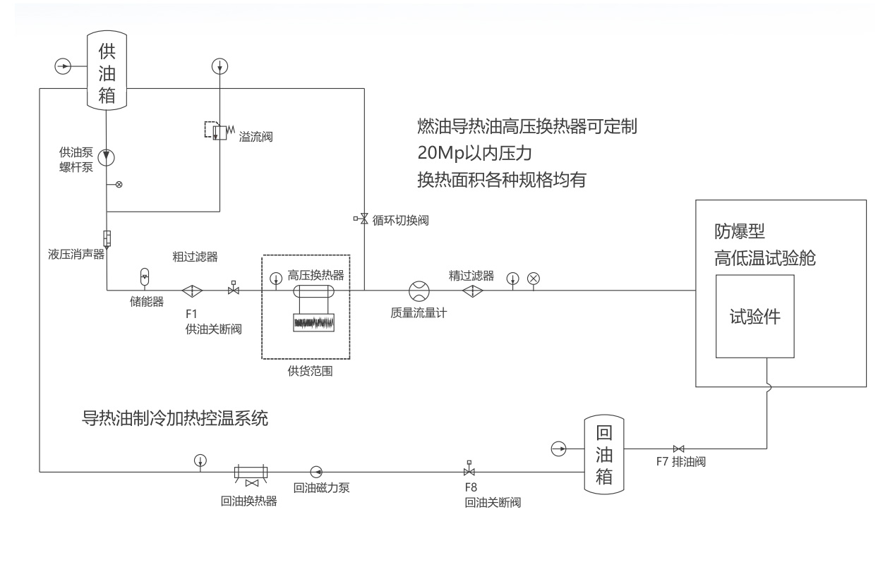 該裝置用于甲方試驗臺做燃油、滑油等試驗時的降溫或升溫。導(dǎo)熱油制冷加熱裝置提供低溫或高溫導(dǎo)熱油,導(dǎo)熱油與燃油在試驗件進(jìn)口換熱器進(jìn)行換熱,使得燃油可以達(dá)到期望的溫度條件,原理示意如上圖所示