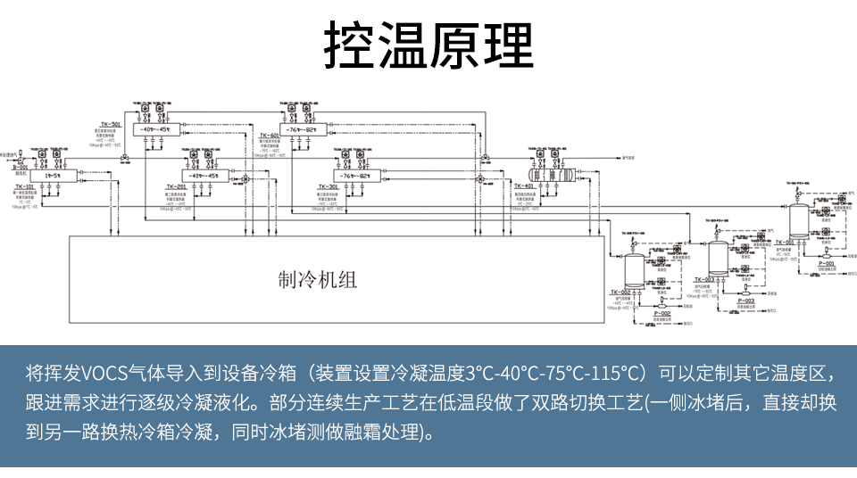 將揮發(fā)VOCs氣體導入到設備冷箱(裝置設置冷凝溫度 3C -40C -75C -115C)可以定制其他溫度區(qū),根據需求進行逐級冷凝液化。部分連續(xù)生產工藝在低溫段做了雙路切換工藝(一側冰堵后,直接切換到另一路換熱冷箱冷凝,同時冰堵側做融霜處理)。