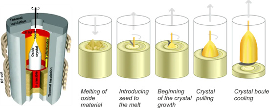 制造工藝始于高質(zhì)量半導(dǎo)體晶體的生長,它是生產(chǎn)電子器件的基礎(chǔ)材料。對于基于硅的器件,zui常見的晶體生長方法是直拉法(Czochralski法),該方法在坩堝中熔化高純度硅,隨后將其冷卻至接近凍結(jié)點,通過旋轉(zhuǎn)種子晶體從熔體中拉出單晶,并切片成薄片晶圓。這種方法可以生產(chǎn)具有均勻晶體結(jié)構(gòu)和優(yōu)良電學(xué)特性的單晶錠。其他廣泛使用的方法還包括Kyropoulos方法、Float Zone方法、Verneuil方法、Bridgman方法等。此外,晶圓經(jīng)過拋光和清洗以創(chuàng)建一個潔凈表面用于后續(xù)處理步驟。