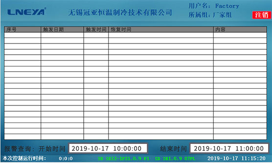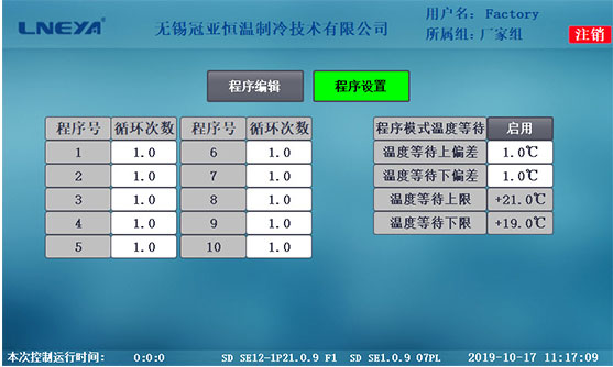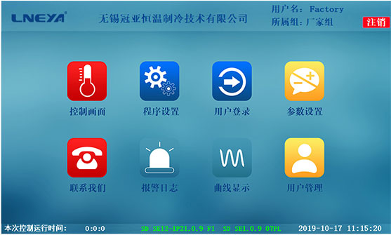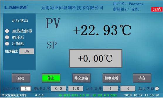 控制畫面,設置控溫參數(shù),查看實時溫度,同時可以檢測查看制冷機組、加熱器、循環(huán)泵工作狀態(tài),當前的溫度控制模式,解熱排空的狀態(tài)