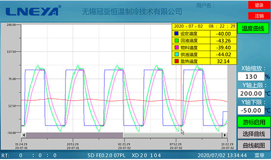 清晰曲線顯示,曲線包含設定溫度、供回液溫度、物料溫度及散熱溫度,可自由選擇是否顯示。同時對溫度的上限和下限進行設置,支持曲線截圖保存